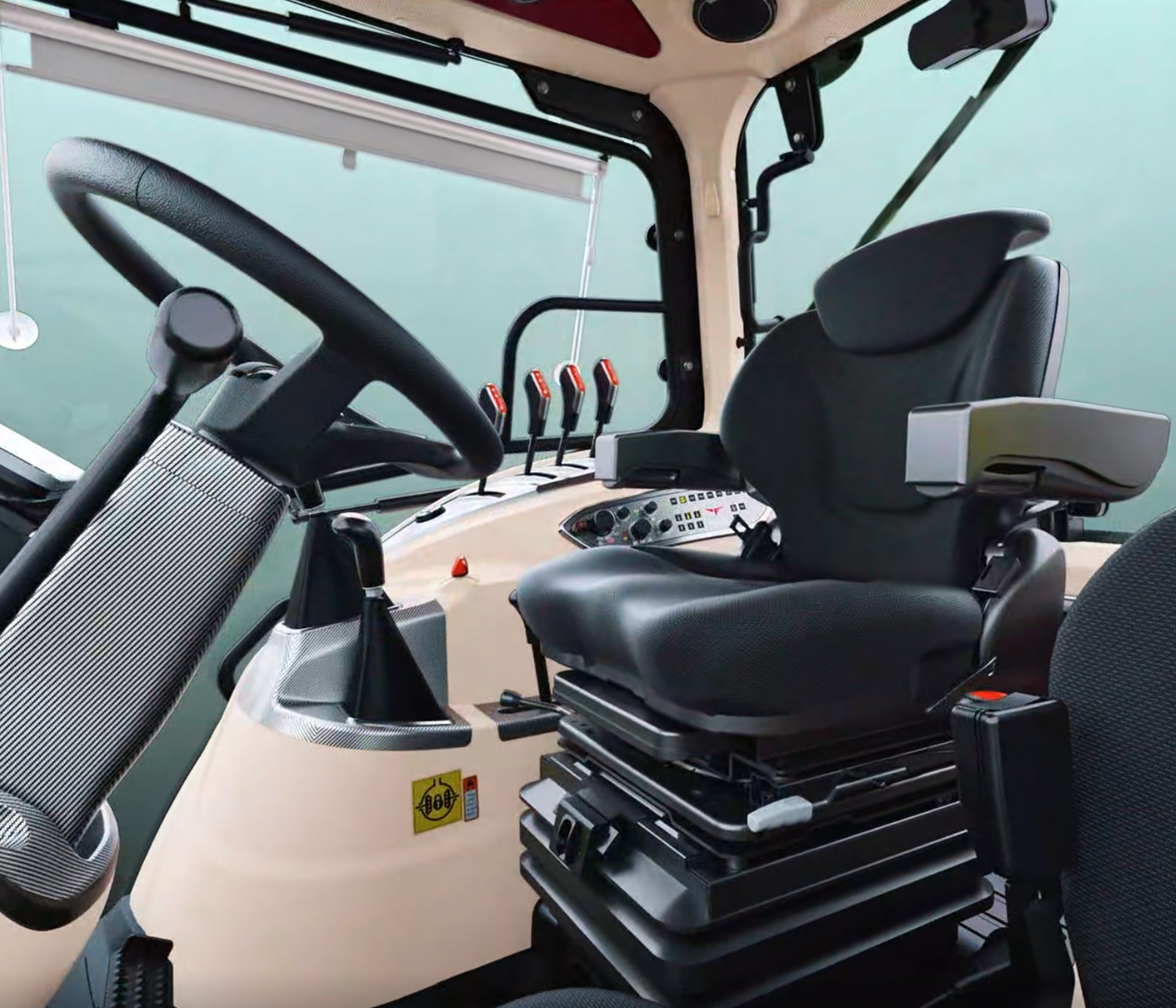 落地窗前檔玻璃, 視野更開闊;標(biāo)配雙面后視鏡,上部平面鏡觀察拖拉機(jī)正后方,下部凸面鏡可觀察輪胎外側(cè)及底部; 駕駛室頂部配置可調(diào)內(nèi)飾氛圍燈,多種燈光模式可選; 標(biāo)配前后噴水雨刷,噴水后玻璃清理更干凈。